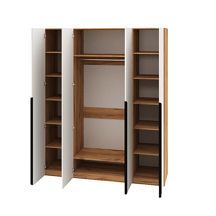 Шкаф имеет четыре распашные двери, которые оснащены доводчиками для плавного и бесшумного закрывания.