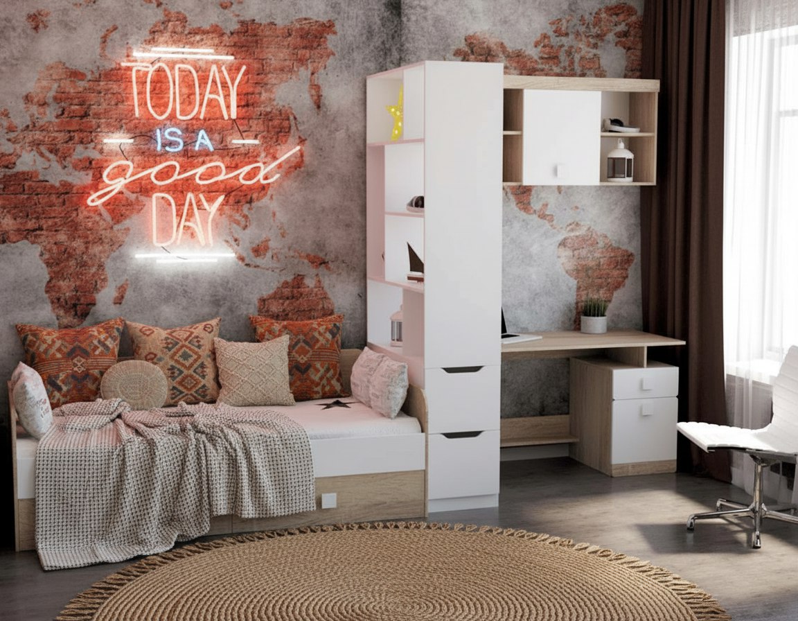 Оттенок натурального дерева "дуб сонома" дает ощущение комфорта и единения с природой, а воздушный белый цвет в интерьере работает как основа для ярких штрихов.