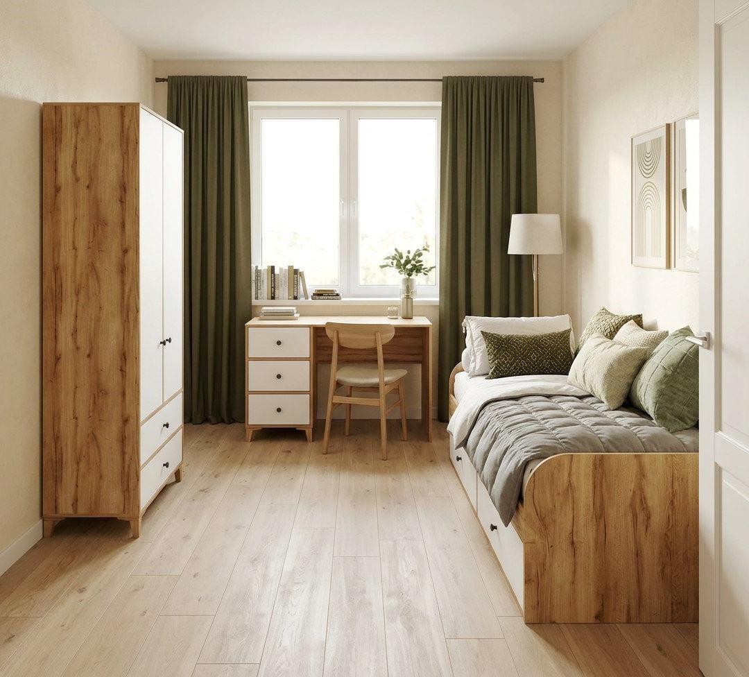 Мебель выполнена из сертифицированного, качественного, экологически чистого ЛДСП класса Е0,5 в сочетании цветов дуб золотистый с белым.