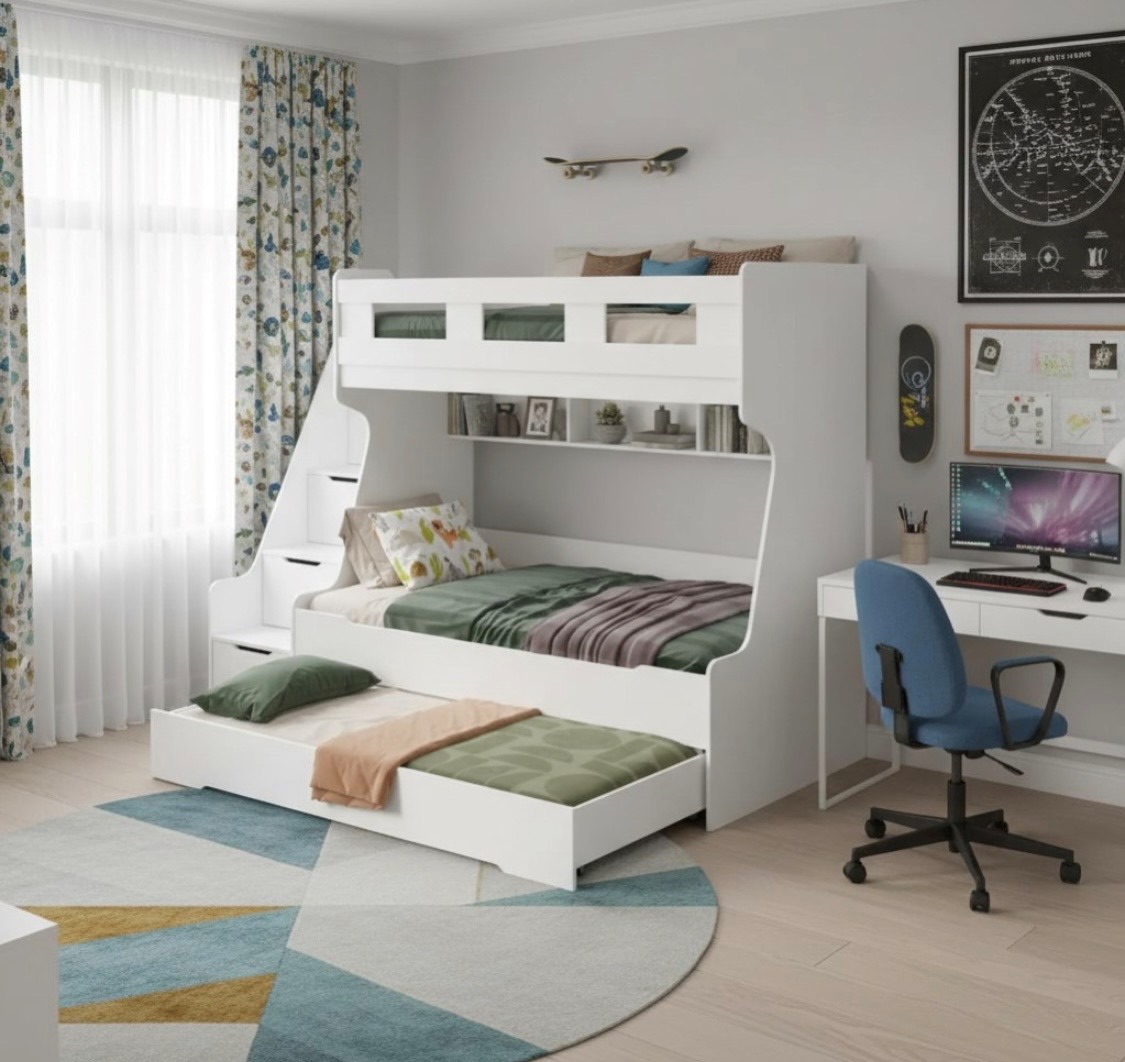 • Модели с лестницей-ящиками. Функциональная лестница с выдвижными ящиками не только обеспечивает безопасный подъем на верхний ярус, но и помогает хранить вещи, игрушки или постельное белье.