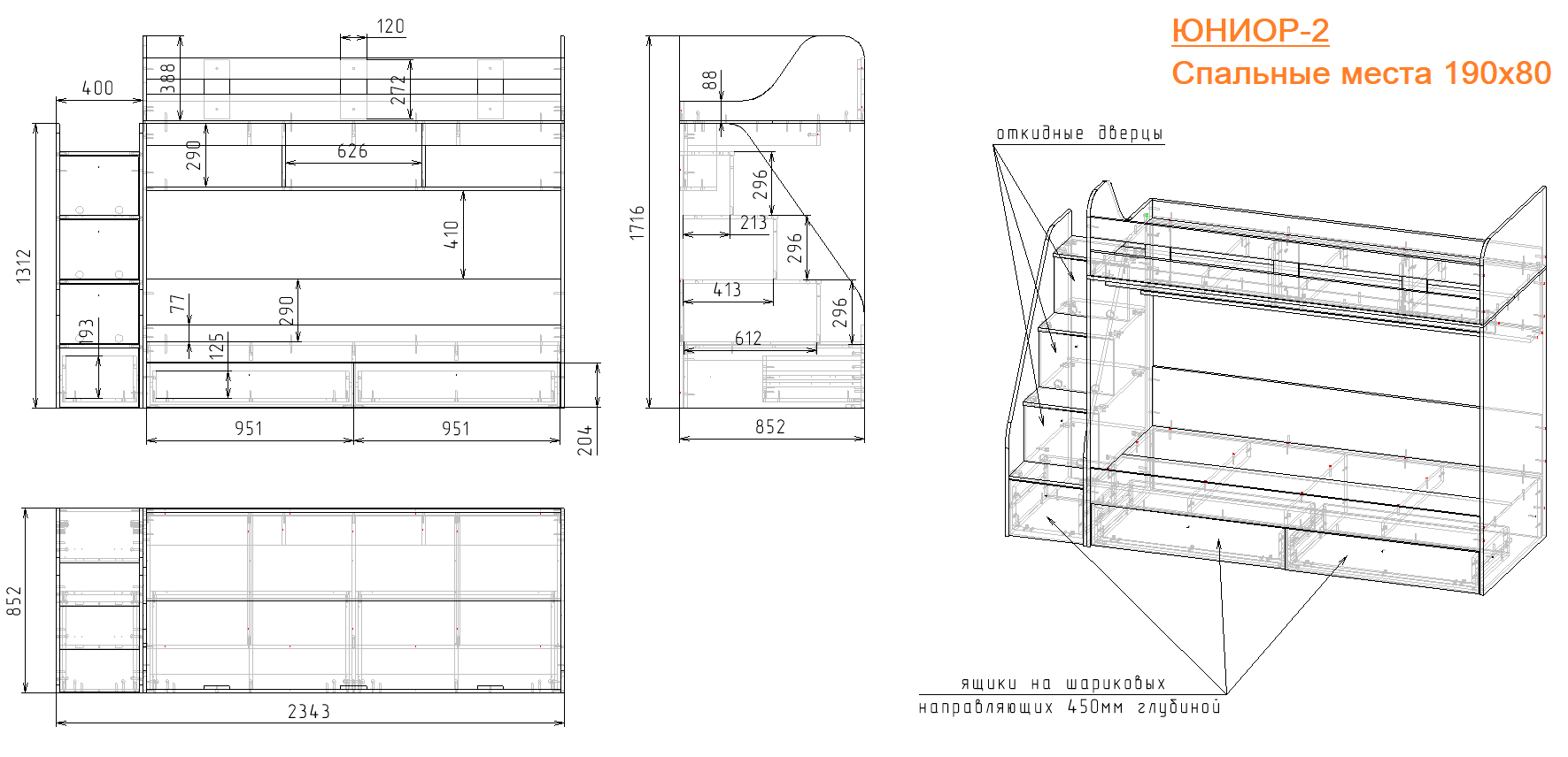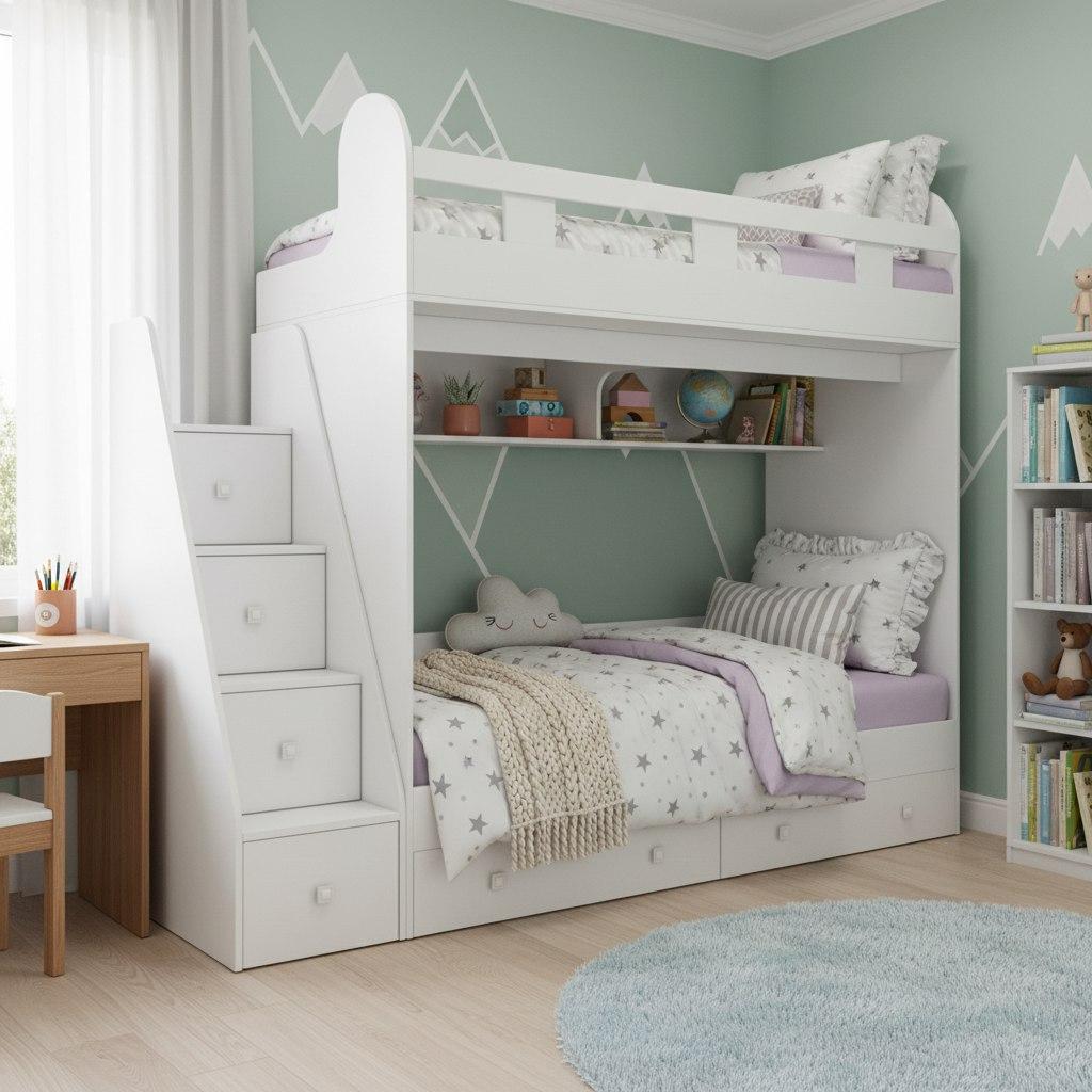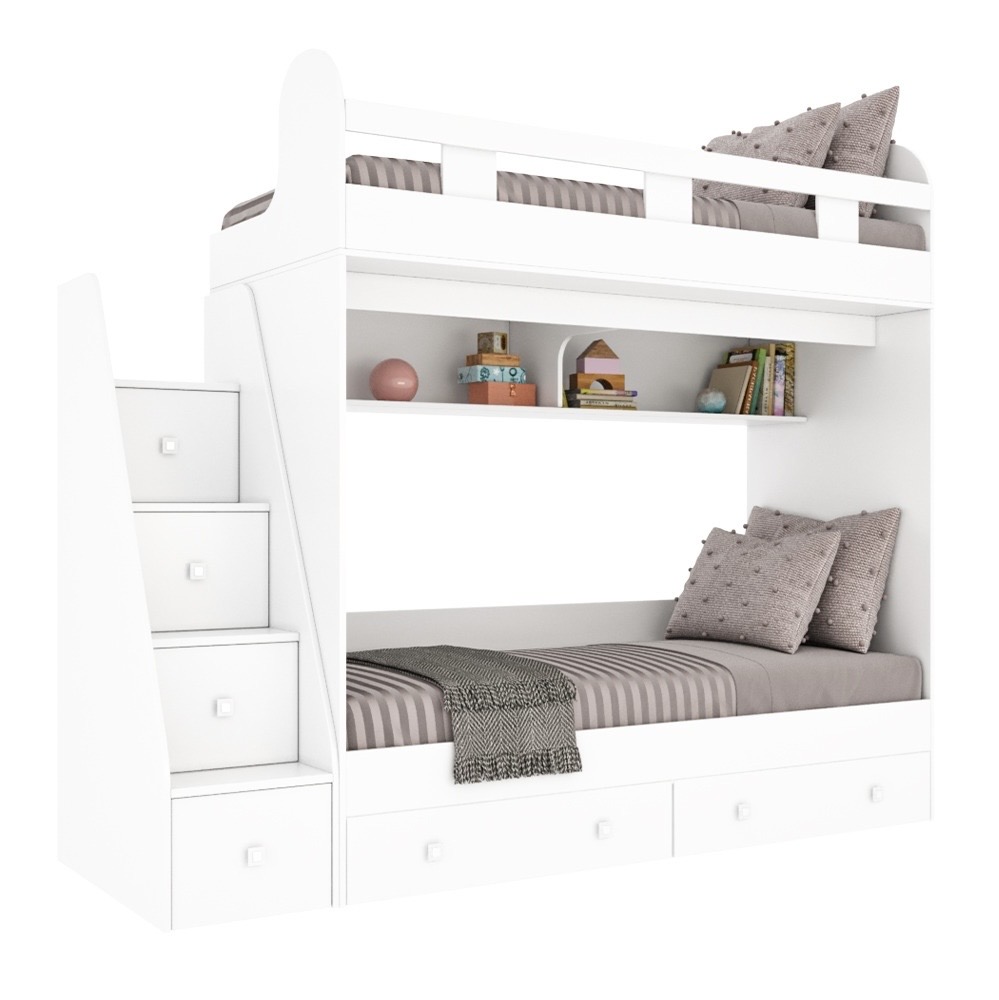 спальное место для двоих, навесная полка для книг и игрушек, вместительные выдвижные ящики под кроватью, а также безопасная лестница, обеспечивающая быстрый и удобный доступ на второй этаж.