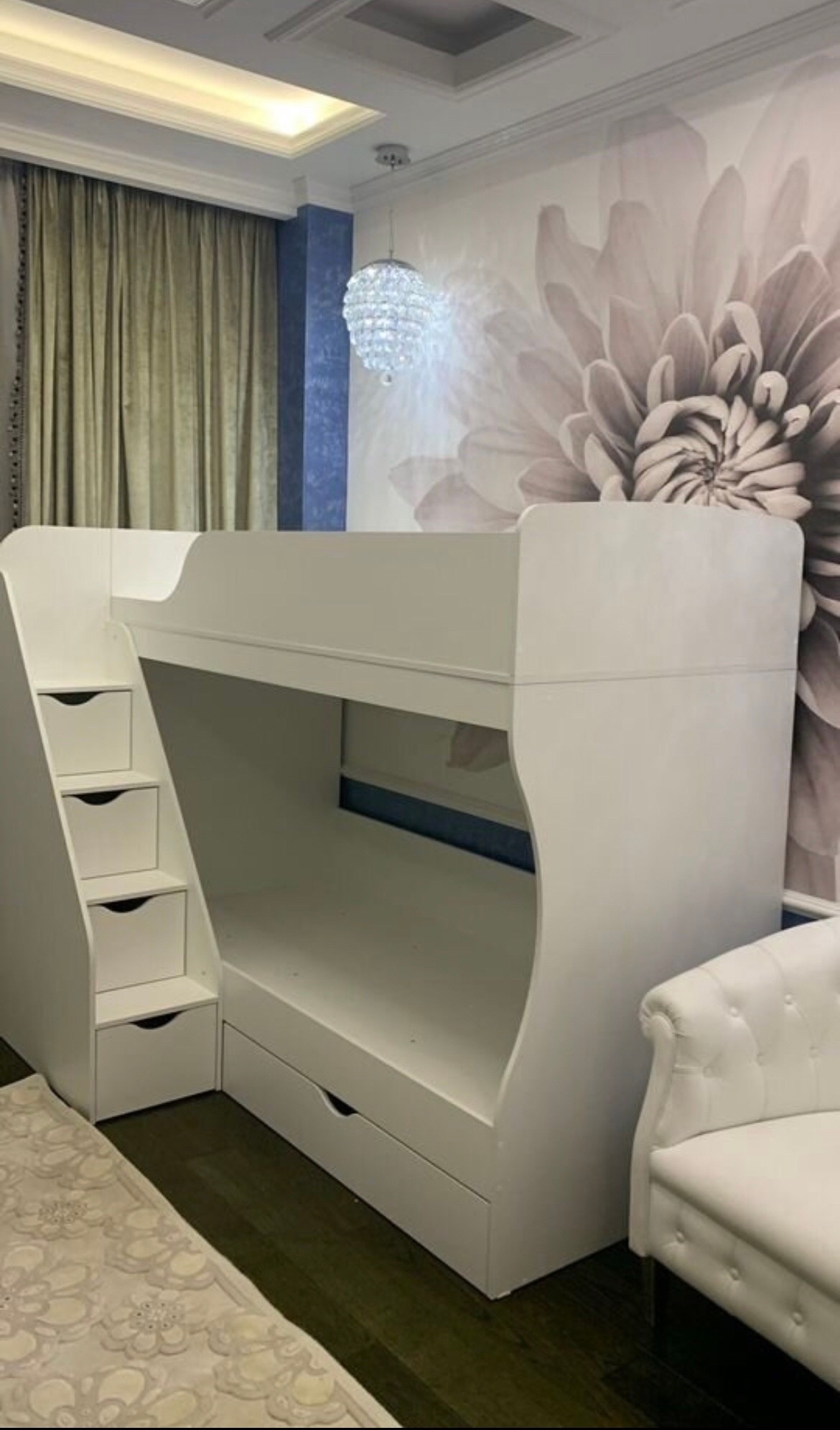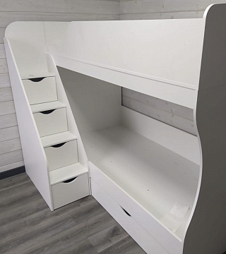Преимущества данной модели - удобная, безопасная лестница с ящиками для игрушек и комфортная высота кровати.