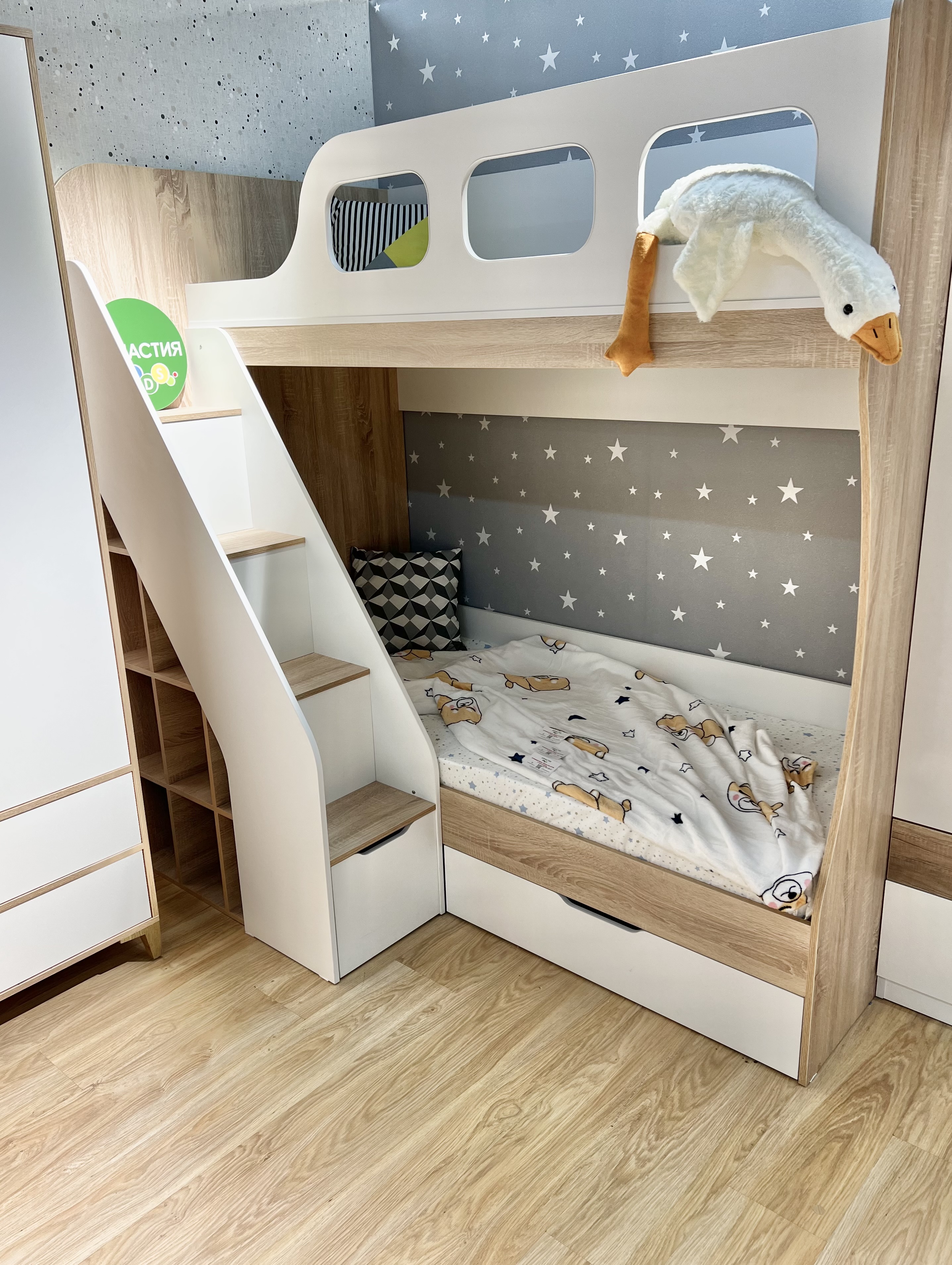 Высокая нагрузка на спальные места. Удобная лестница. Прочный, высокий, безопасный бортик