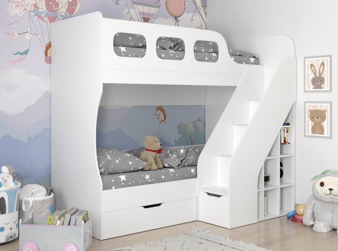 В нижнюю кровать встроен выдвижной ящик для белья и игрушек.