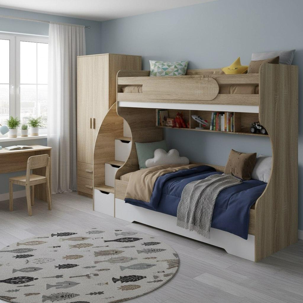 Увеличенное нижнее спальное место позволяет комфортно разместиться ребенку вместе со взрослым.