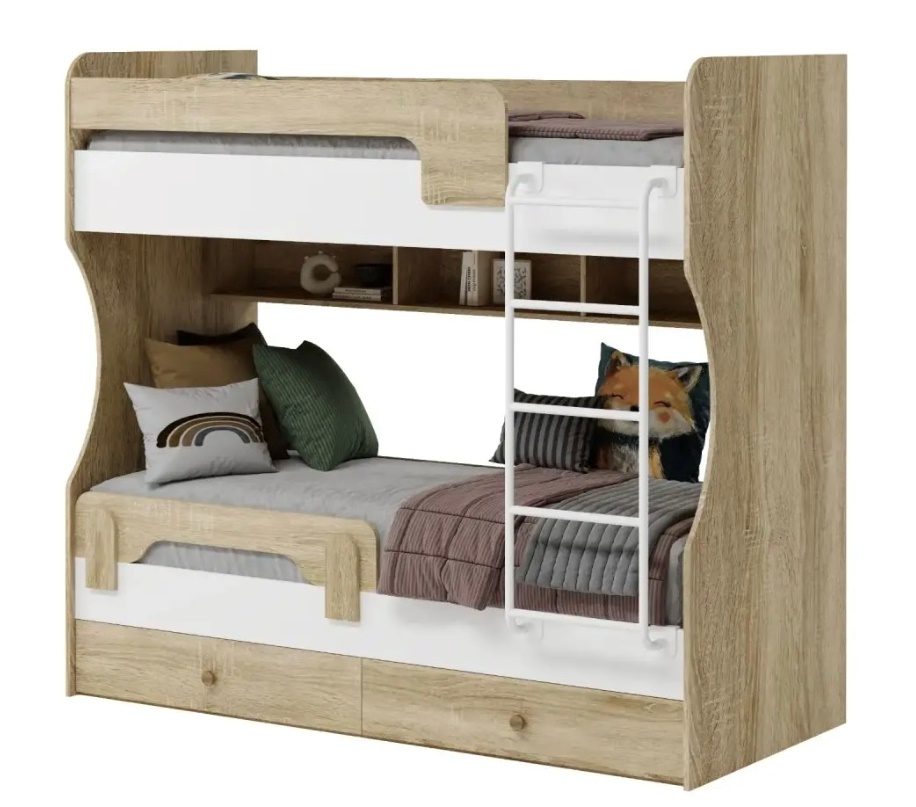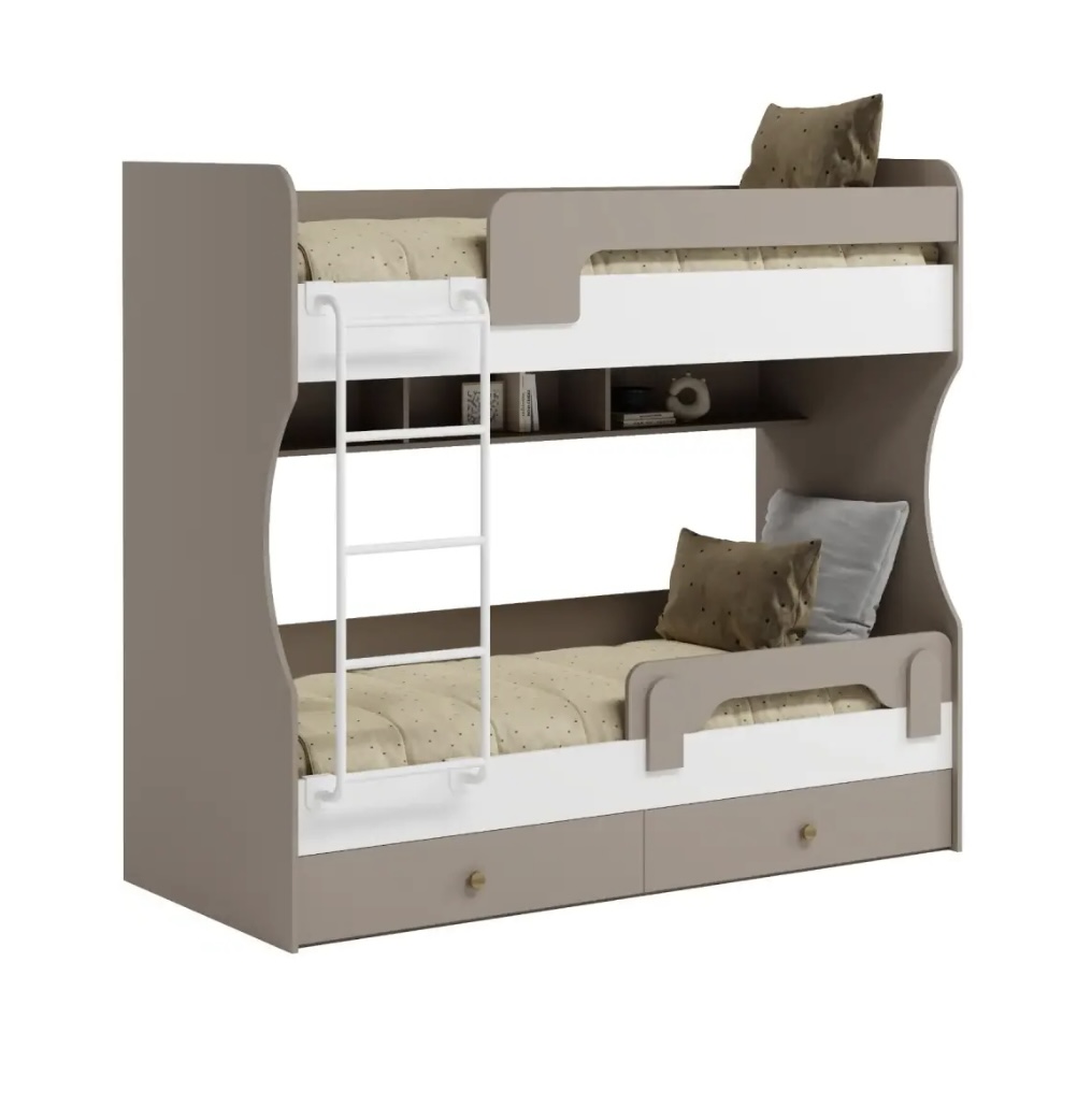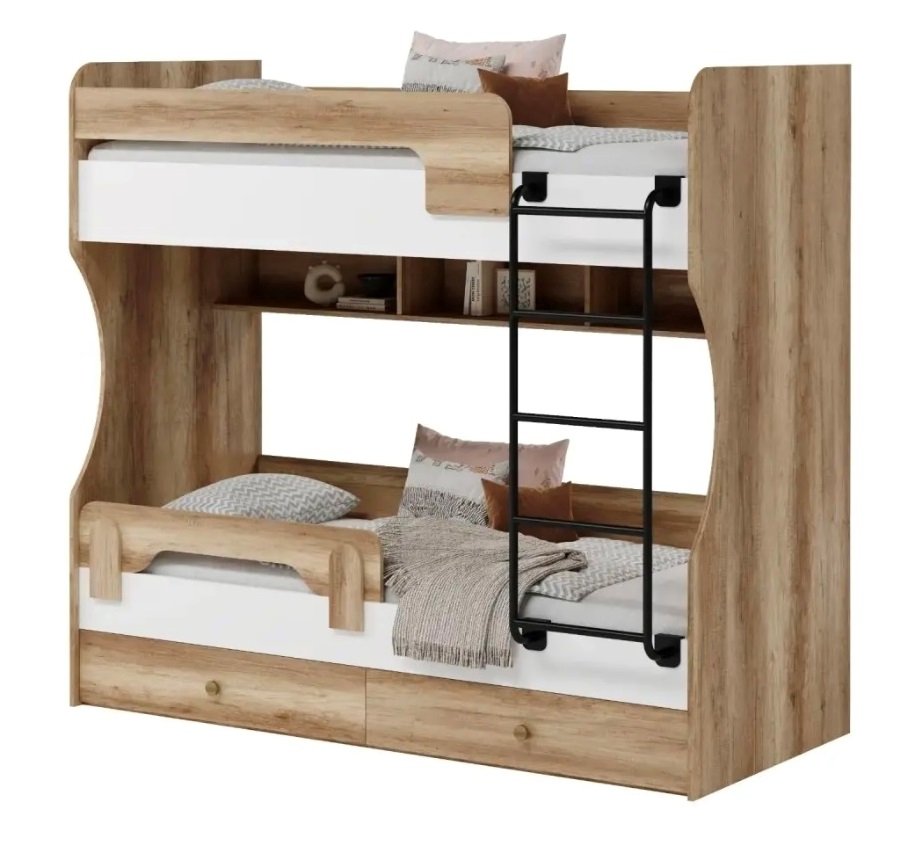 Двухъярусная кровать в декоре под дерево идеальна для любых интерьеров.