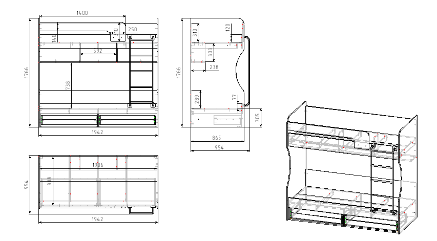 Габариты кровати: ширина 1942, высота 1766, глубина с учетом лестницы 954 мм