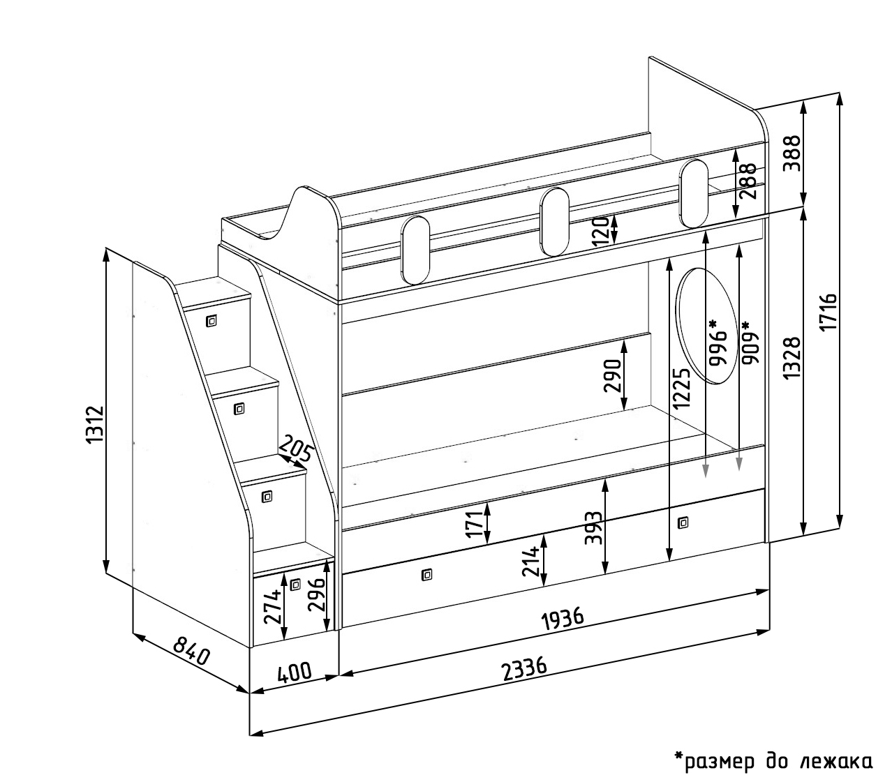 Габариты кровати с учетом лестницы: