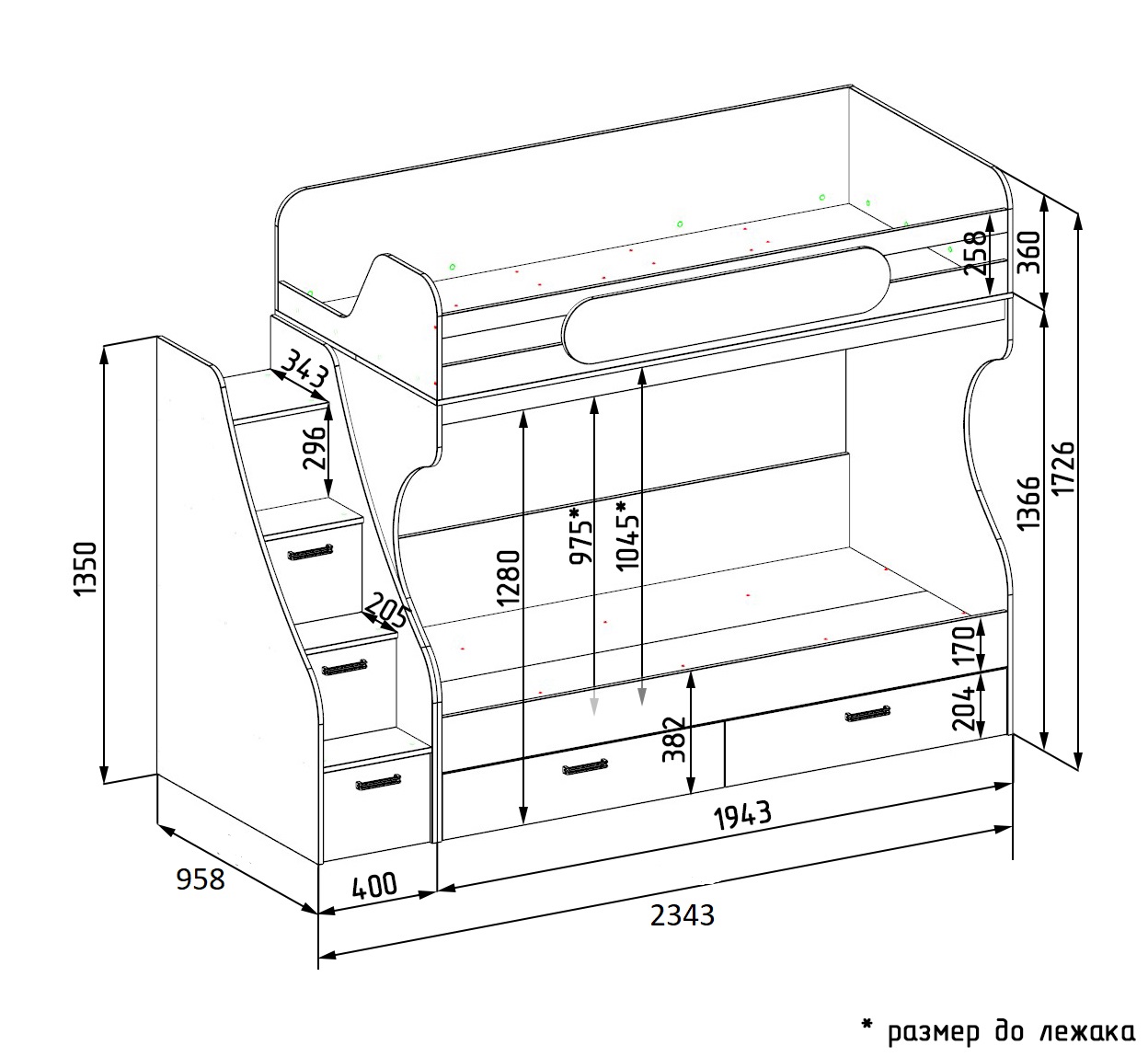Габариты кровати с учетом лестницы: ширина 2343, глубина 958, высота 1726 мм