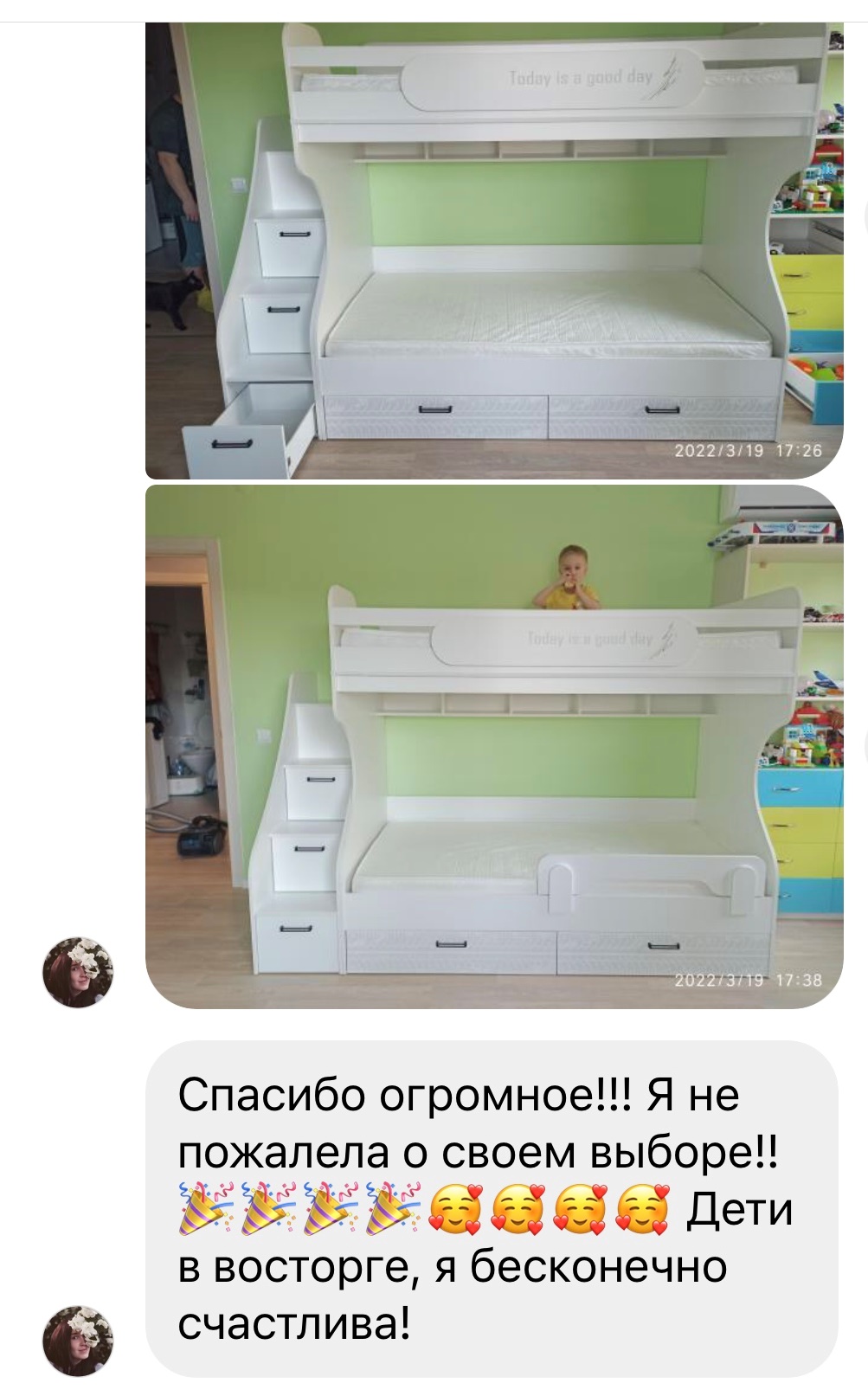 <virtues>Шикарная кровать! </virtues> <limitations>Нет</limitations> <comment>Шикарная кровать! Дети в восторге! Большие спальные места, очень качественные ящики! Спасибо огромное производителю! От всей души желаю вам процветания! И отдельное спасибо менеджеру, очень вежливая, при покупке ответила на все интересующие мне вопросы, всё по делу и очень оперативно :f09fa5b0:</comment>