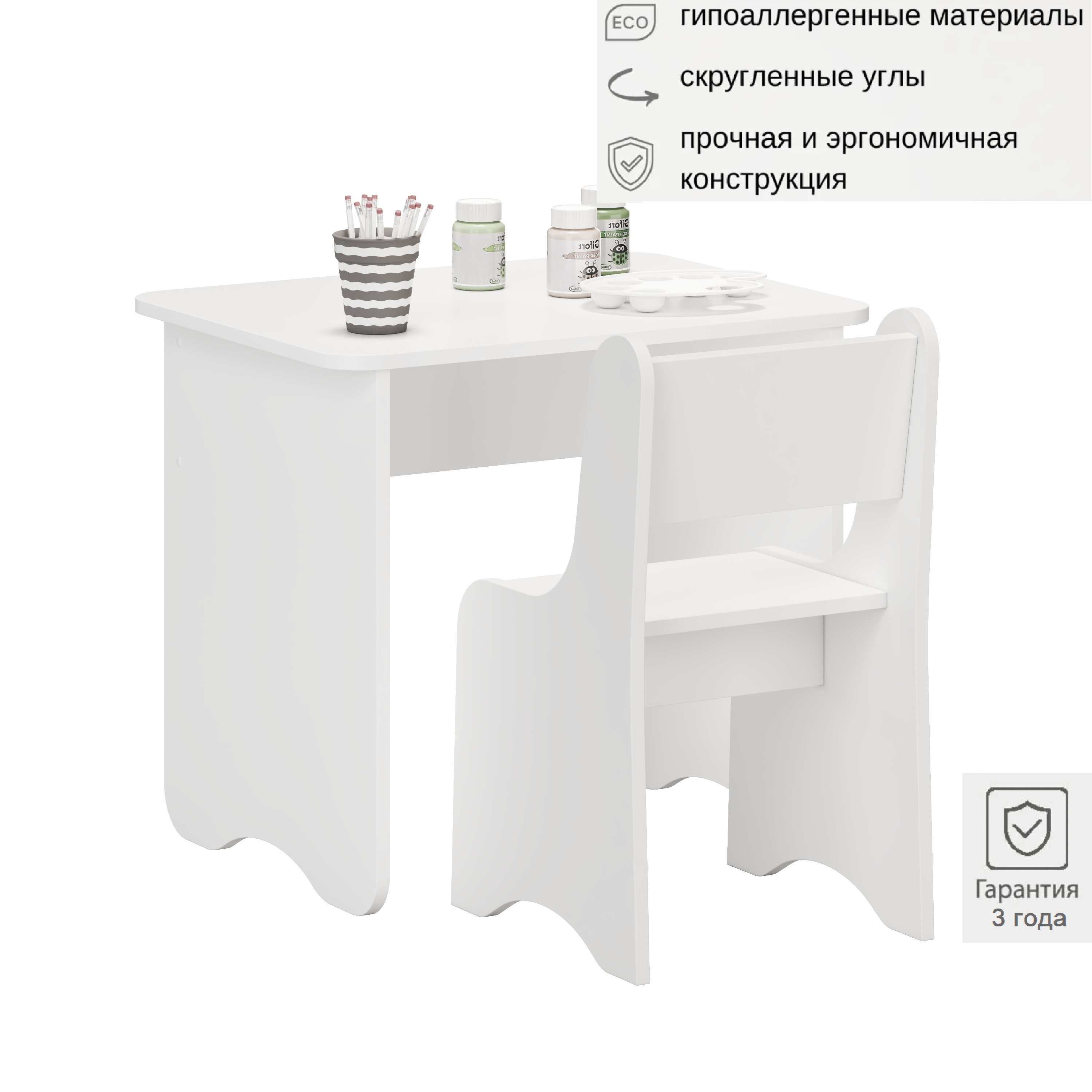Все торцы стола и стульчика закруглены и обработаны ударопрочной кромкой ПВХ (не кант!)