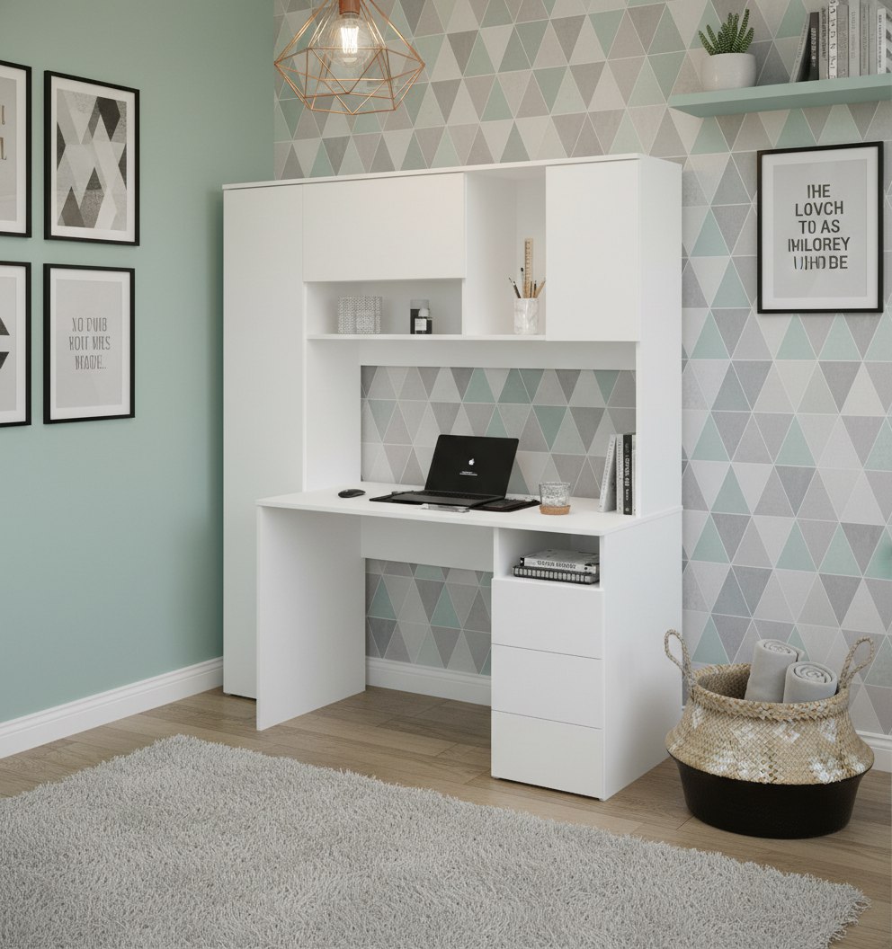 Просторная поверхность, удобные полки и ящики позволят разместить учебники, книги и канцелярию.