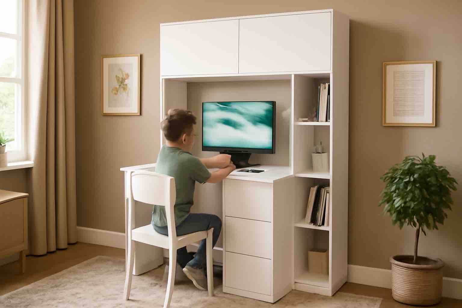 Просторная поверхность, удобные полки и ящики позволят разместить учебники, книги и канцелярию.