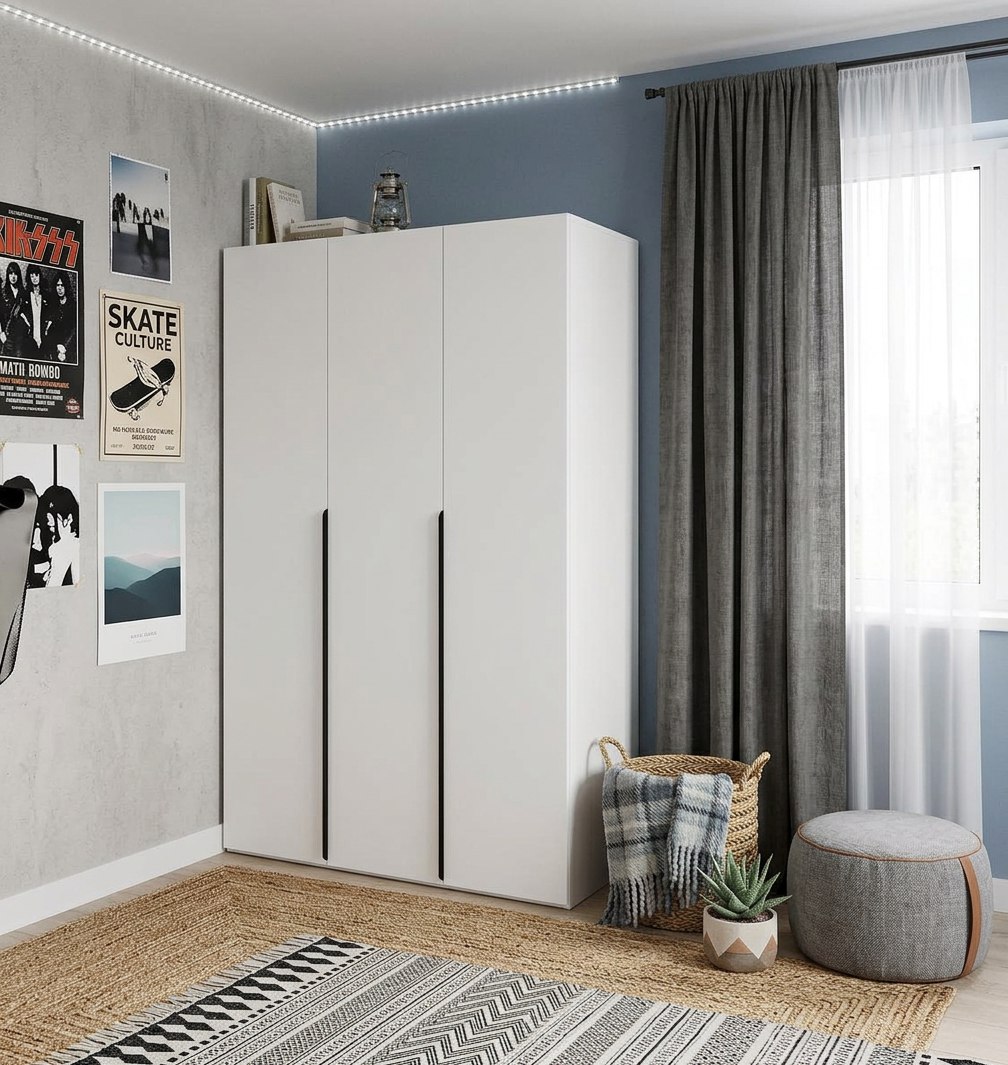 Шкаф имеет три распашные двери, которые оснащены доводчиками для плавного и бесшумного закрывания.