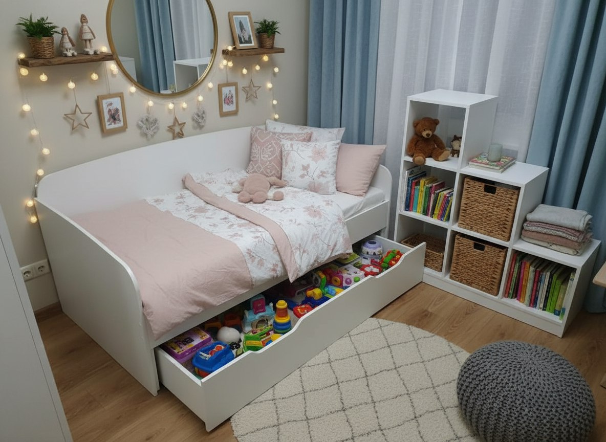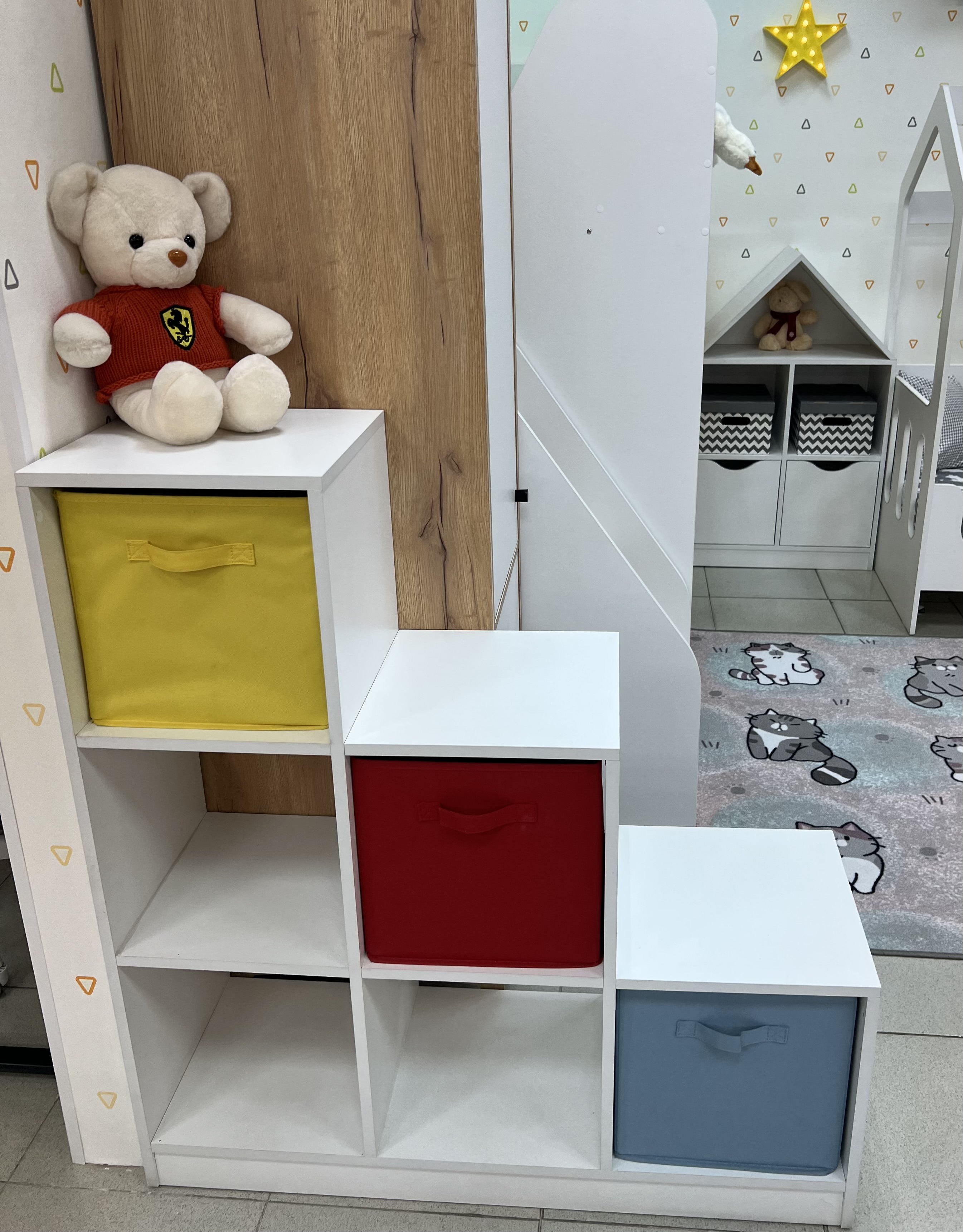 Такой стеллаж станет практичным дополнением в интерьере детской комнаты.