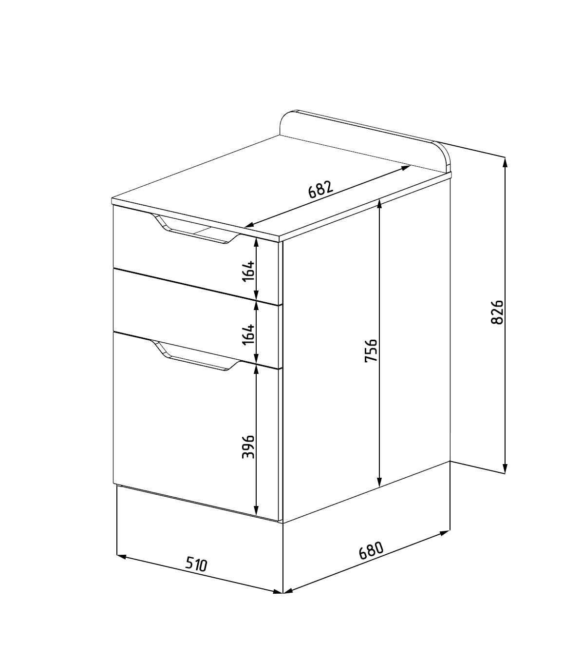Габариты тумбы: ширина 510, общая высота 826, глубина 682 мм