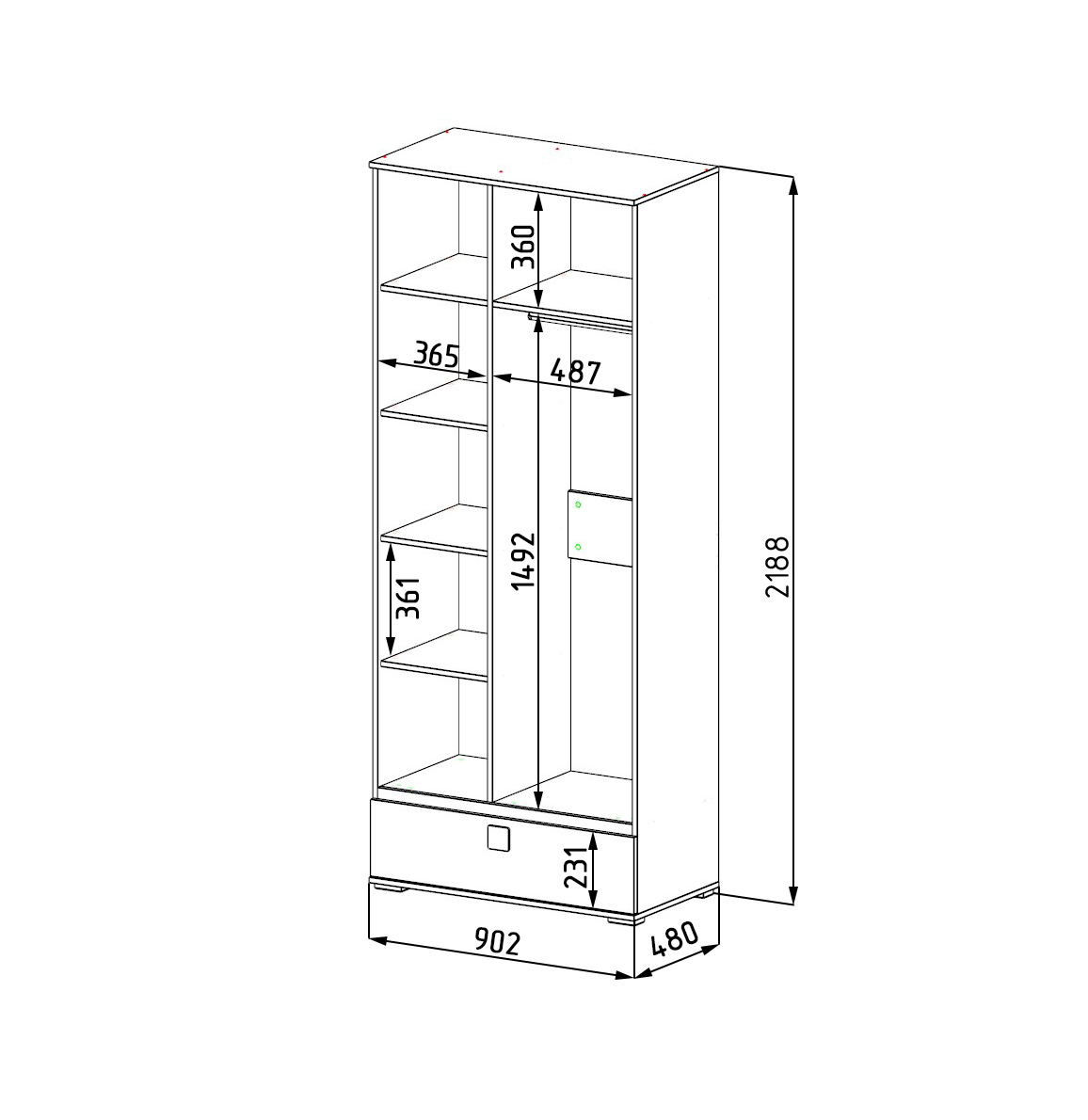 Габариты шкафа: ширина 902 х высота 2188 х глубина 480 мм