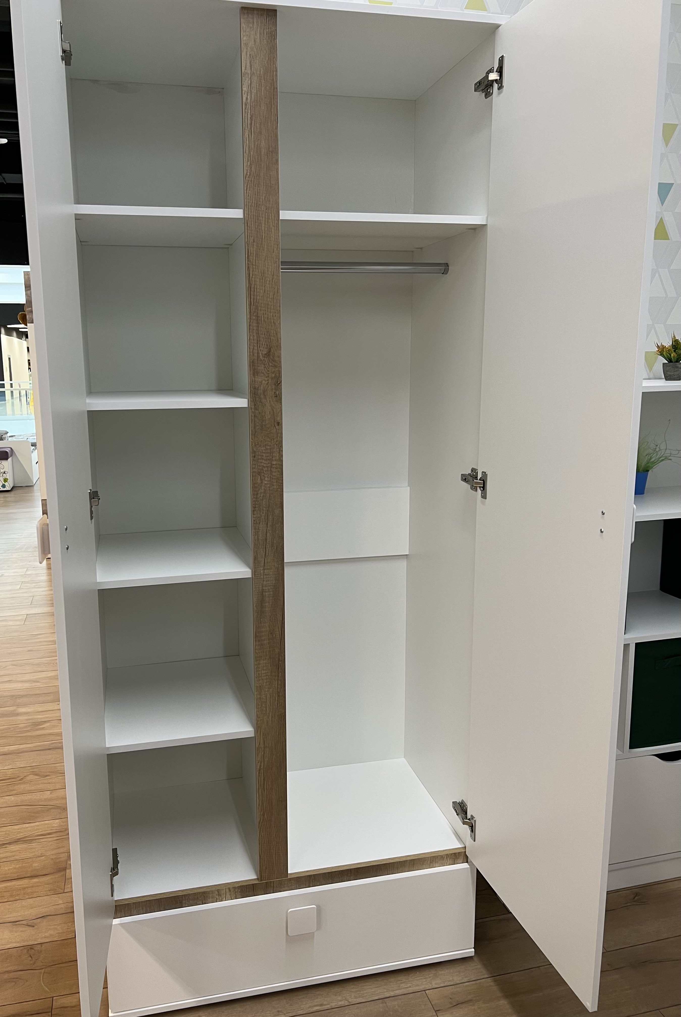 Внутри шкафа расположены штанга и боковые полки.