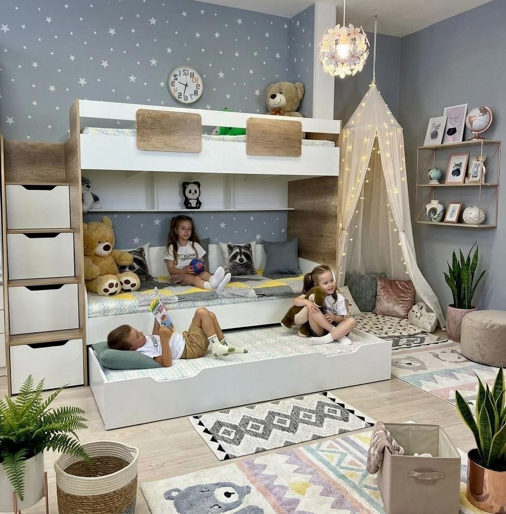 В итоге отличная кровать для троих сынишек, места стало много в комнате благодаря шкафчикам в лестнице. Дети счастливы, это главное!!!</virtues>