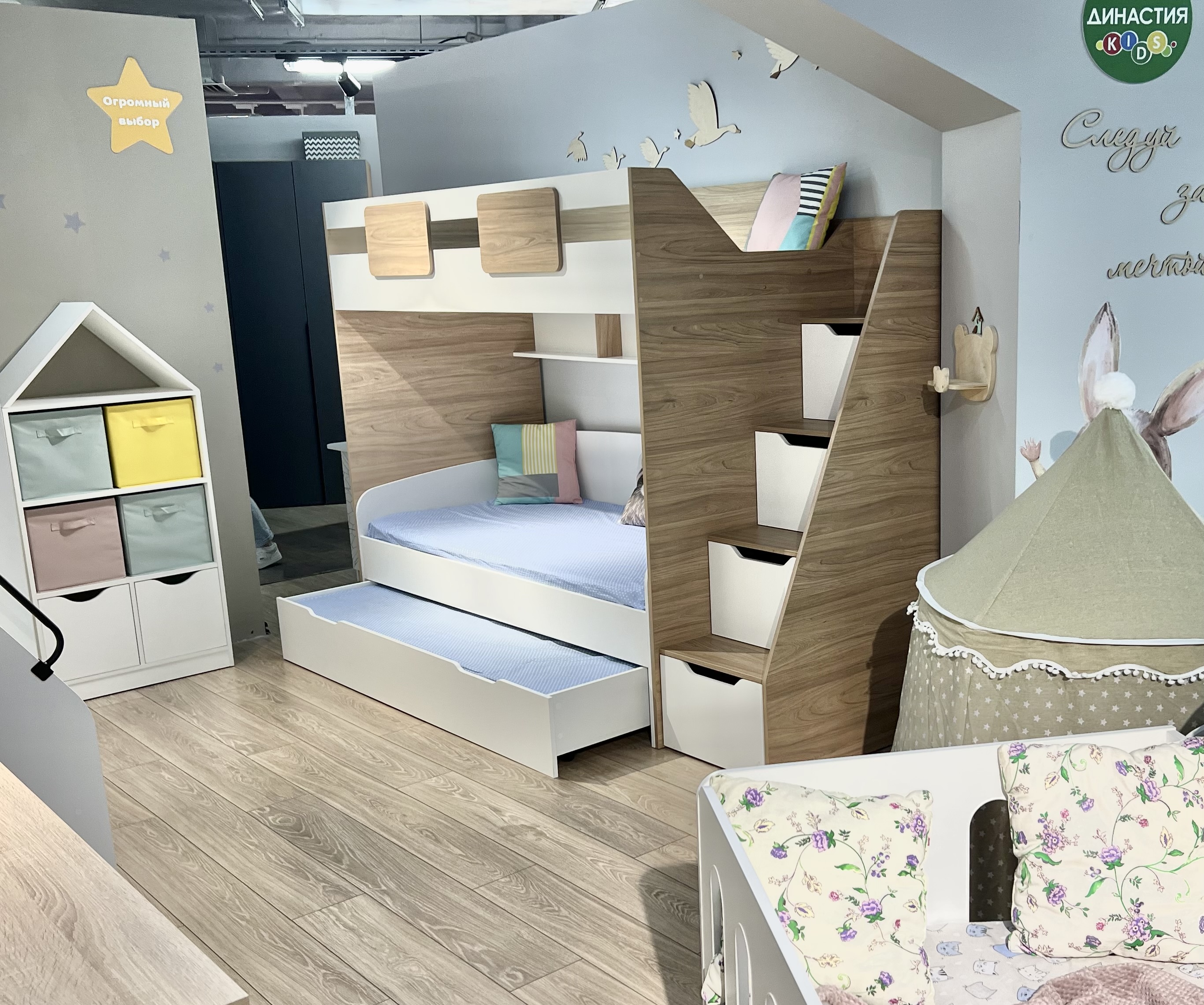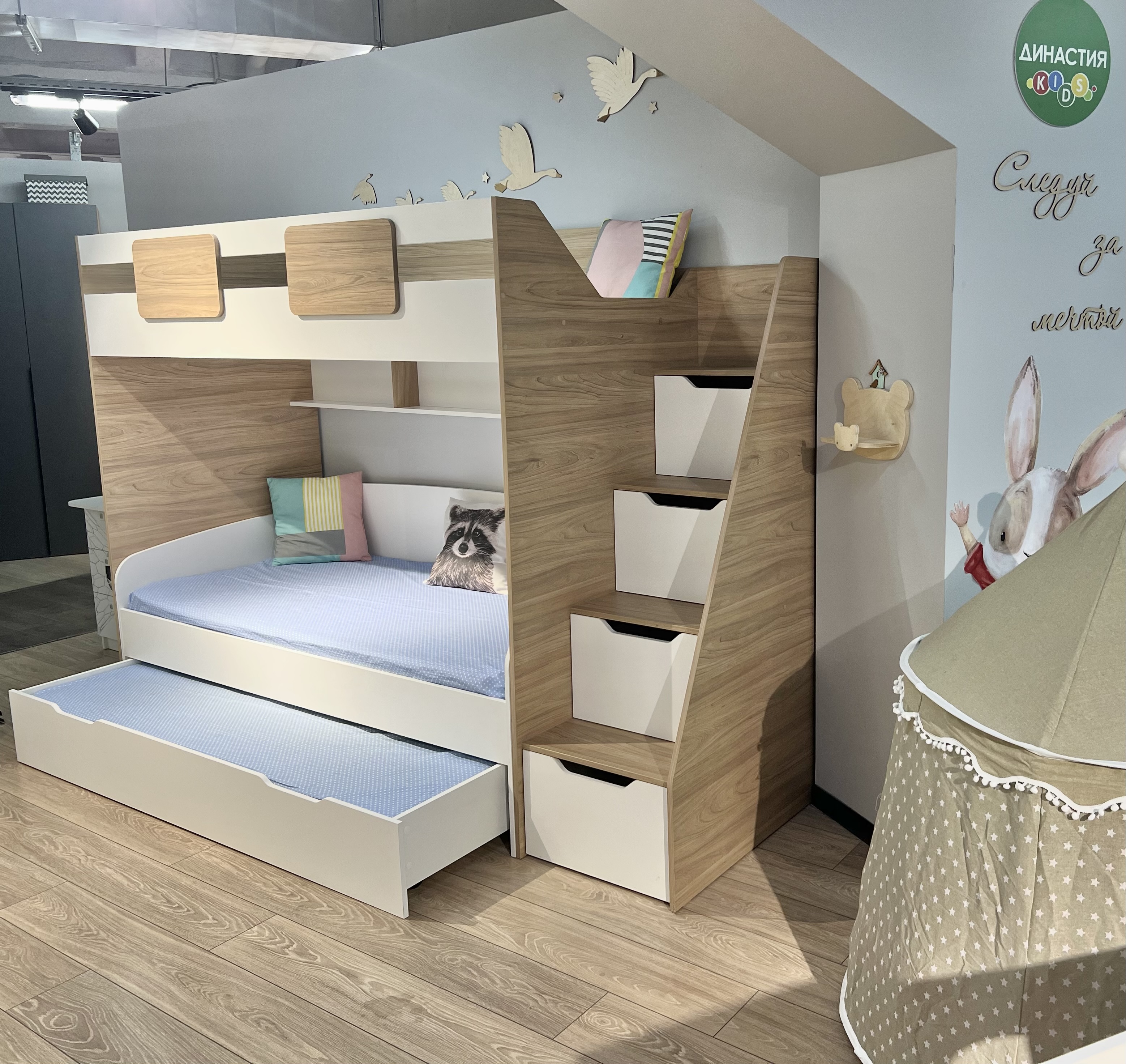 В лестницу встроены ящики для игрушек - удобно и практично.