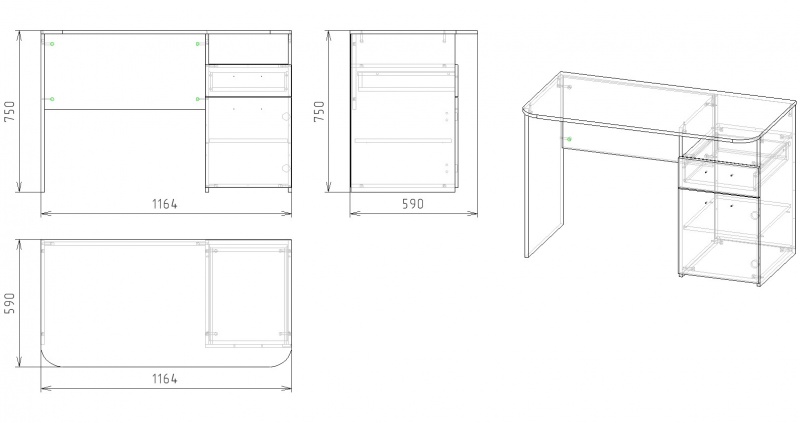 Габариты стола: ширина 1164 х высота 750 х глубина 590 мм