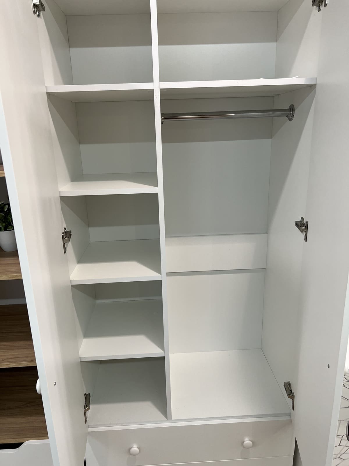 Внутри шкафа имеются штанга для вещей и дополнительные полки.