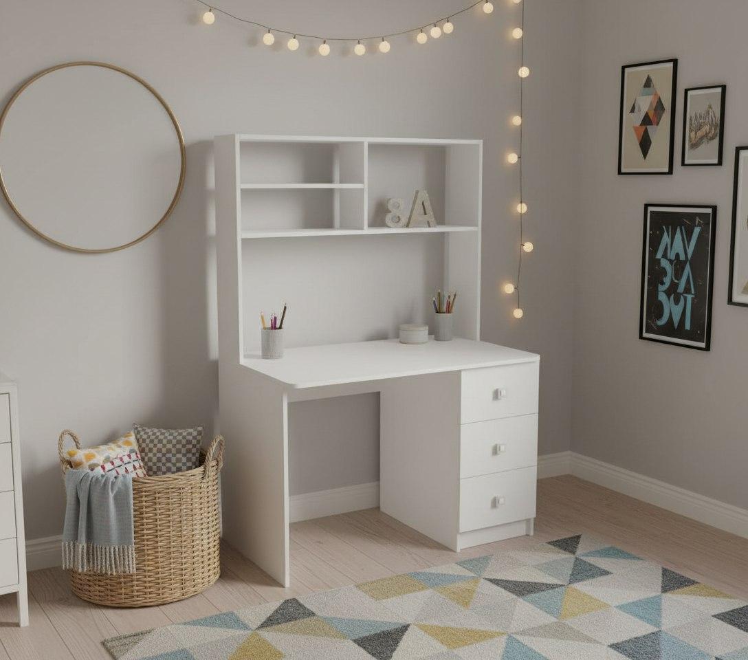 Практичный и удобный стол с надстройкой займет немного места в комнате и в тоже время позволит разместить учебники, любимые книги и игрушки.