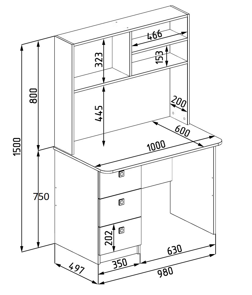 Габариты стола: ширина 1000 х высота до столешницы 750 (общая высота 1500 мм)  х глубина 600 мм