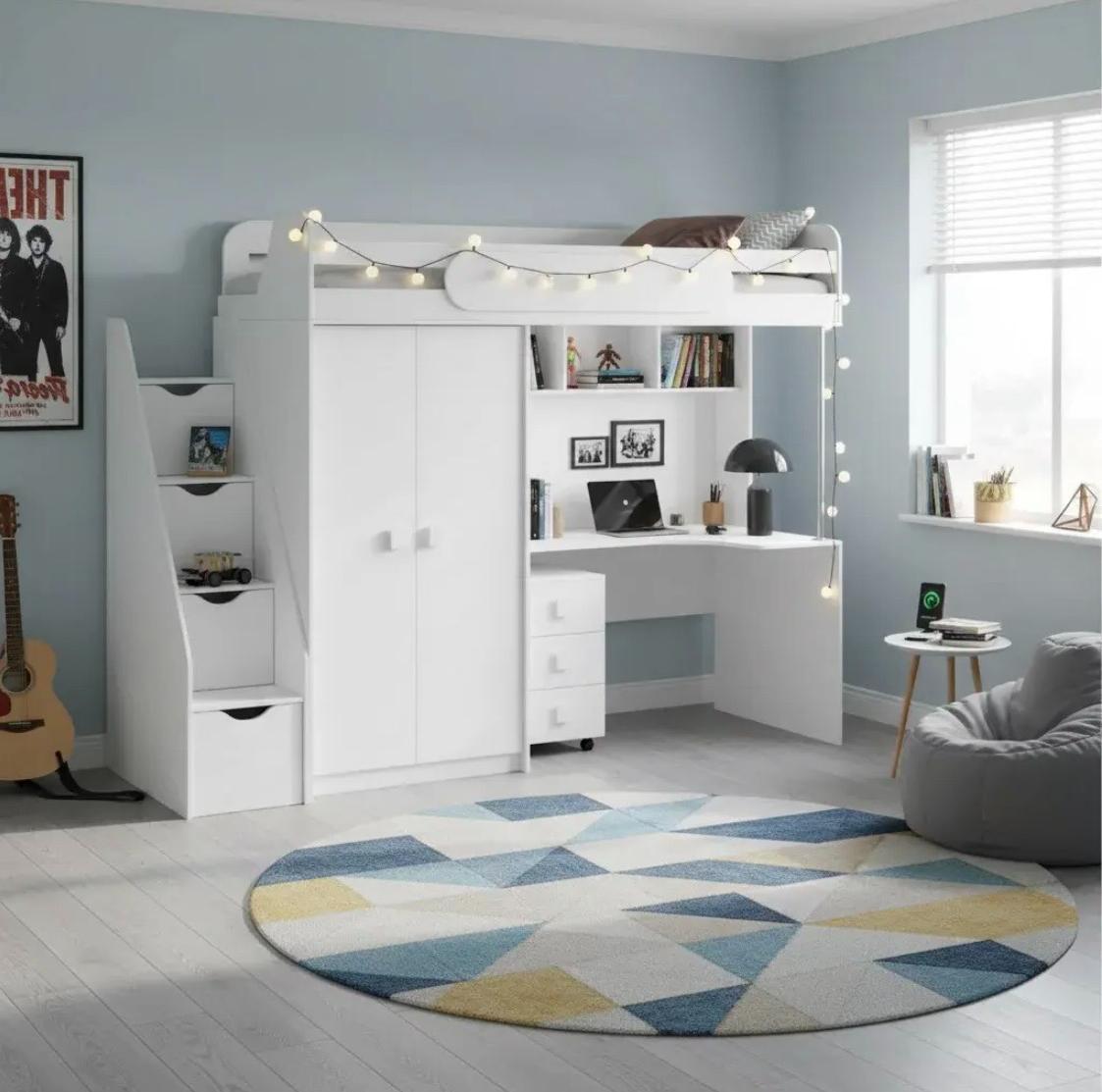 Кровать-чердак с рабочим пространством и шкафом – идеальное решение для детской комнаты.