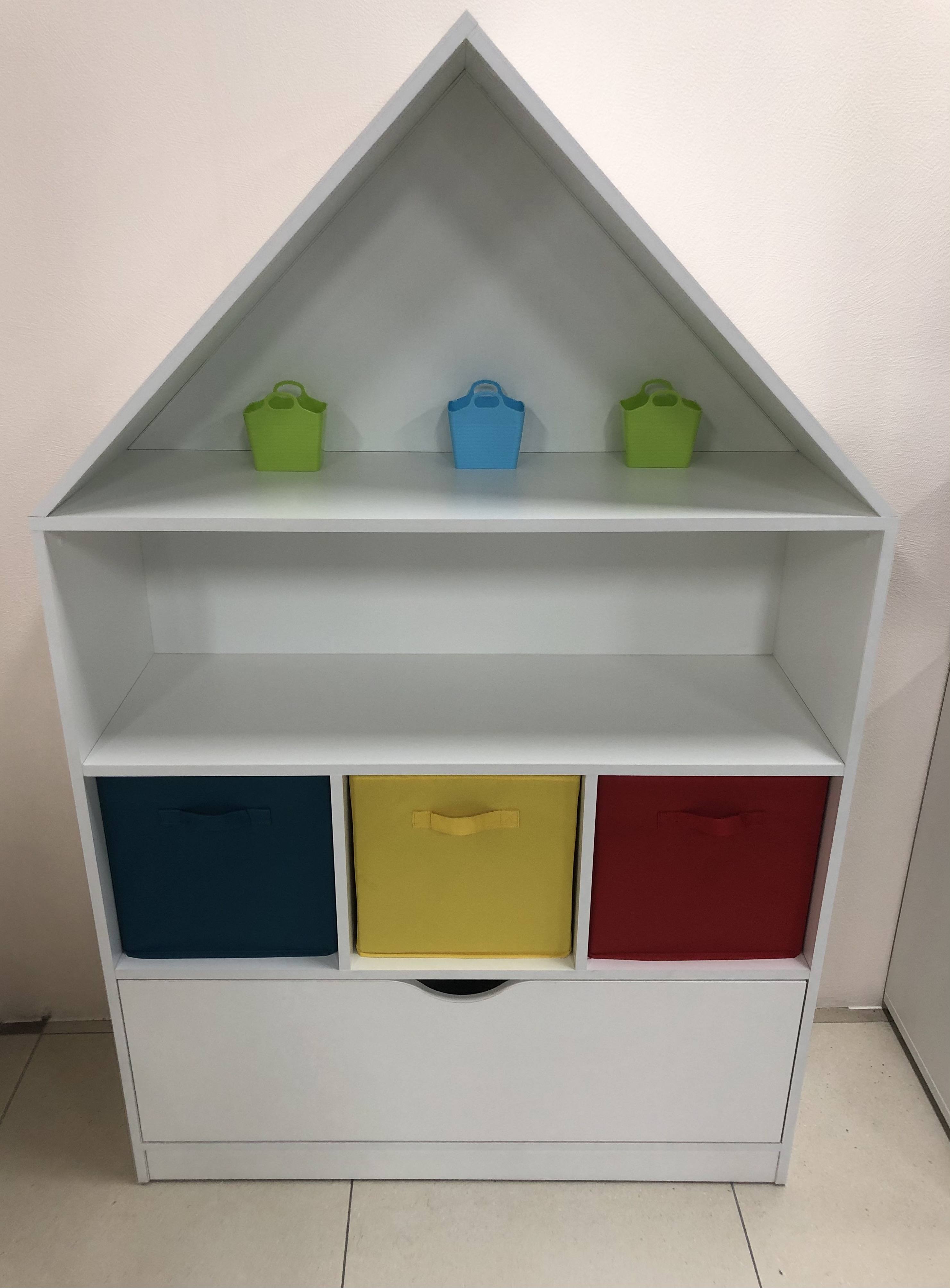 Стеллаж в виде домика - оригинальное и практичное дополнение в интерьере детской комнаты.