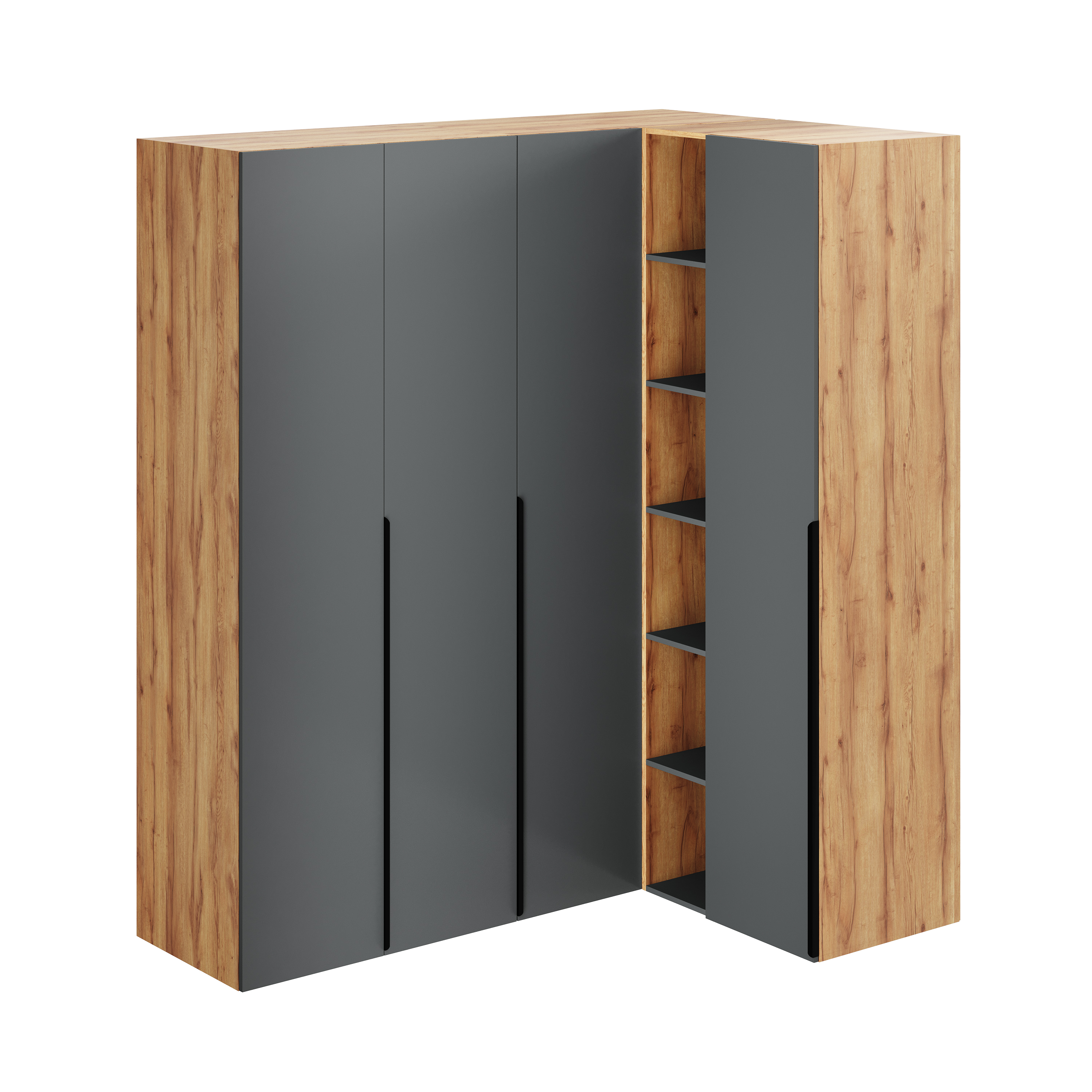 Распашной двухстворчатый шкаф + угловой шкаф + стеллаж переходной + пенал коллекции Брайт Графит