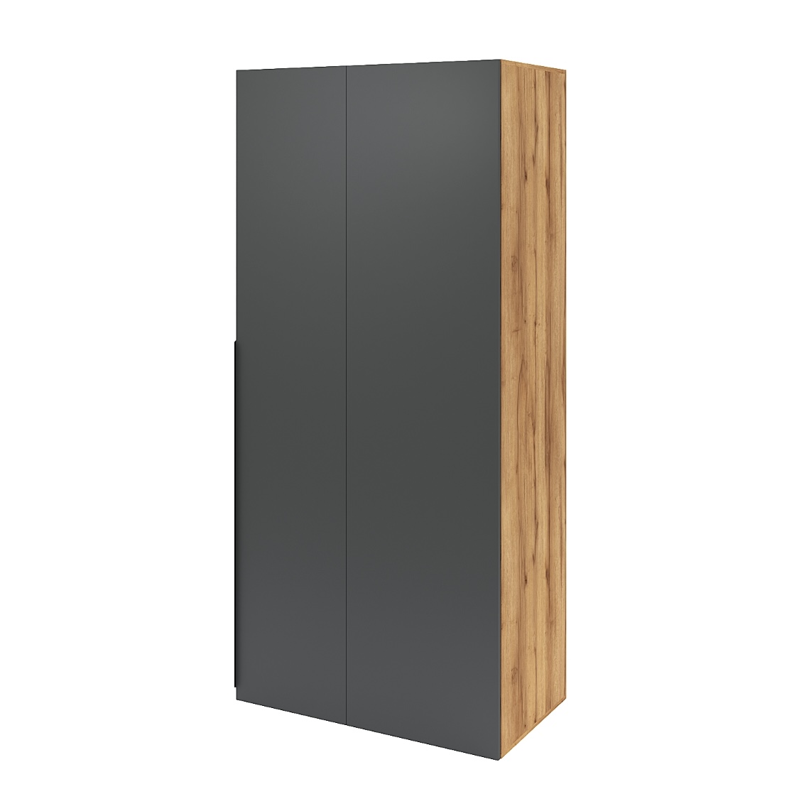 Натуральный декор дуб золотистый с выразительными полосами и следами от сучков прекрасно сочетается с однотонным декором графит.